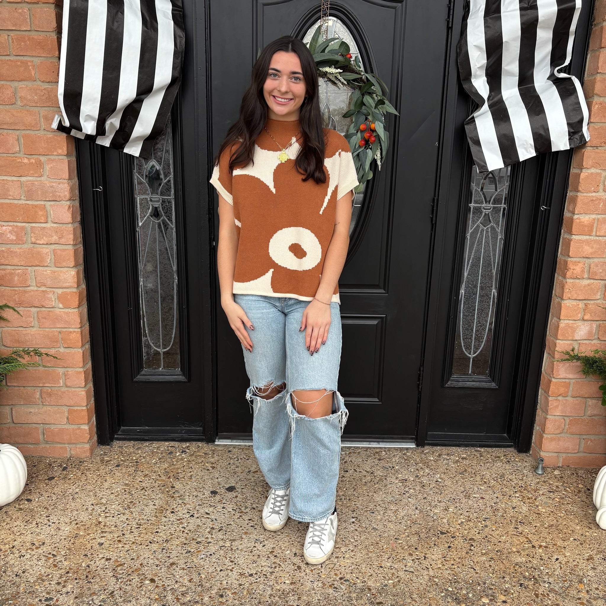 This short sleeve half neck sweater is great for Texas fall. It has a burnt orange and cream floral design!