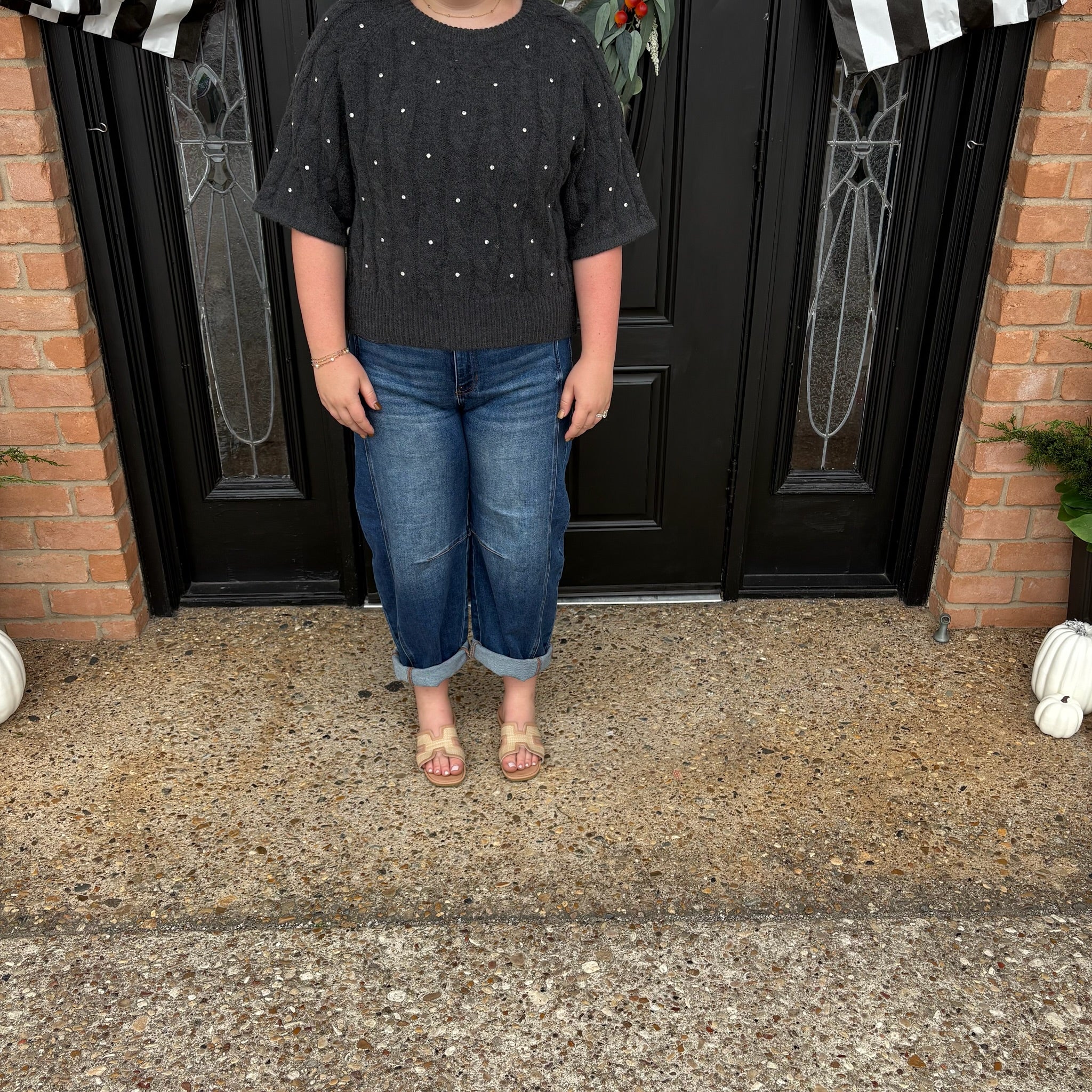 The Phyllis Sweater is a short sleeved, charcoal colored, cable knit sweater embellished with rhinestones.