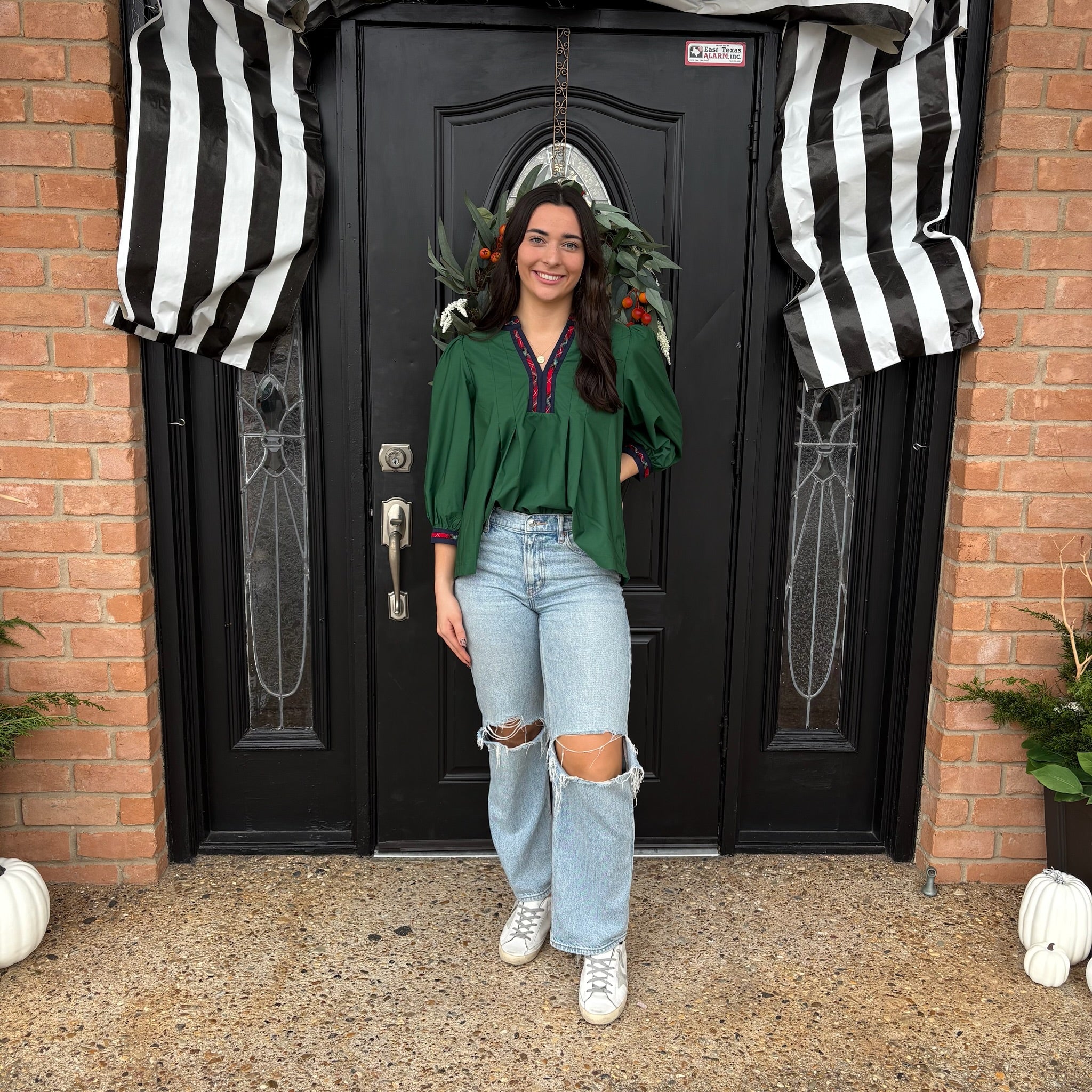 The Quinn Blouse is a cotton, green, 3/4" sleeve blouse with puffy sleeves and a red, tartan plaid v-neckline with navy blue trim. This blouse is a great holiday must-have and is also available in navy blue.