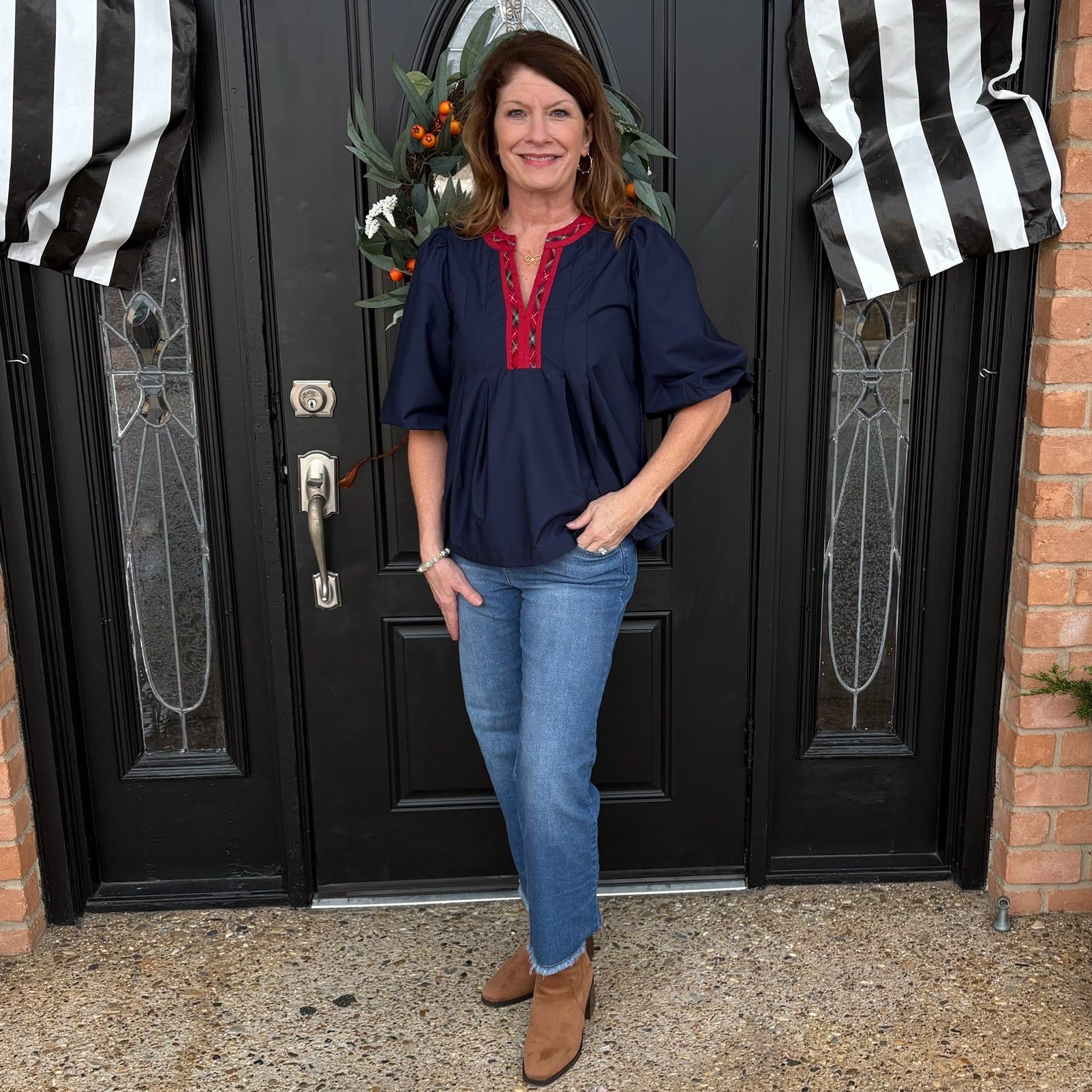 The Quinn Blouse is a cotton, navy blue, 3/4" sleeve blouse with puffy sleeves and a red, tartan plaid v-neckline with red trim. This blouse is a great holiday must-have and also available in green.
