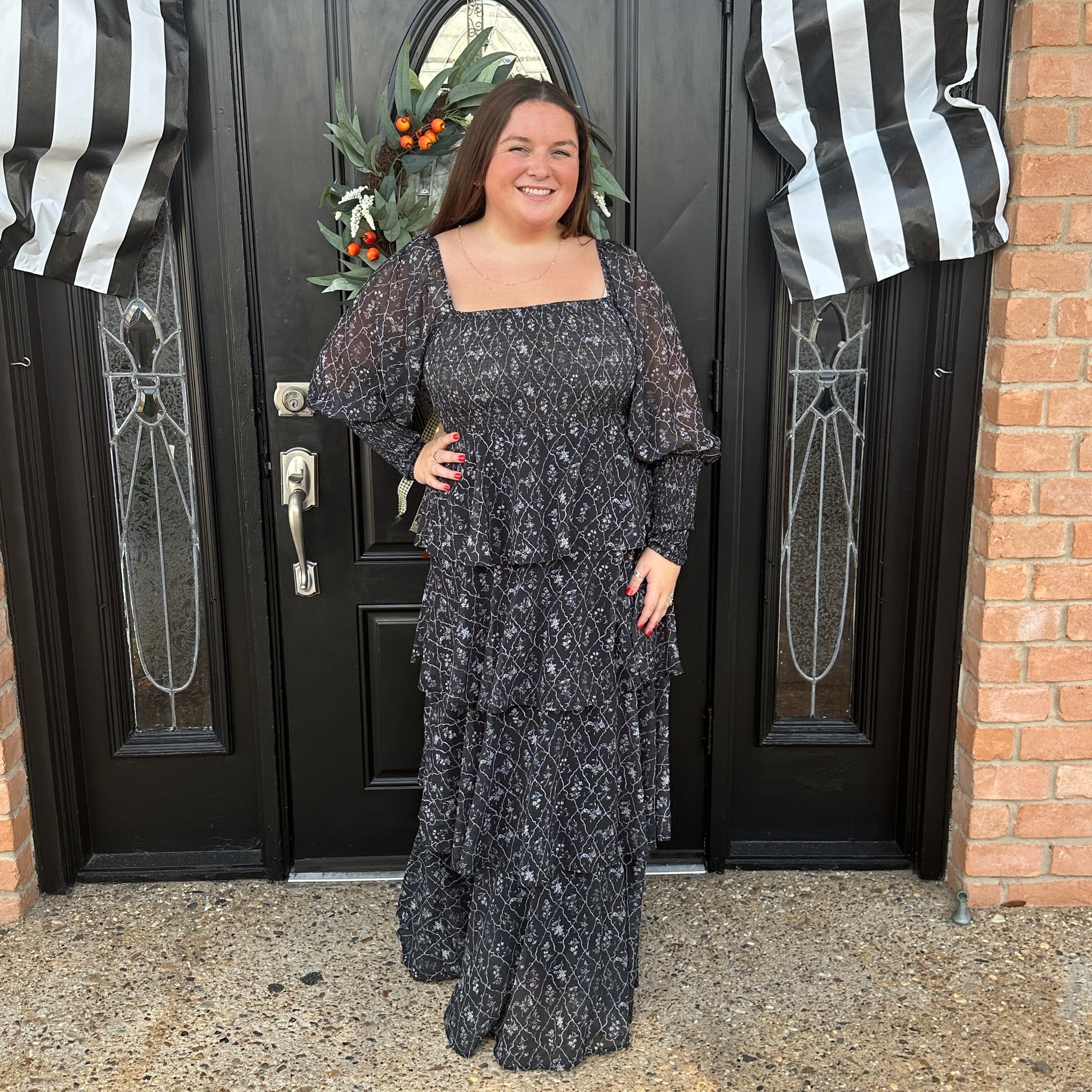The Simple Floral Maxi Dress is just that! This dress is a black and white floral dress with ruching on the top and the ends of the sleeves. The dress also has a gorgeous tiered skirt!