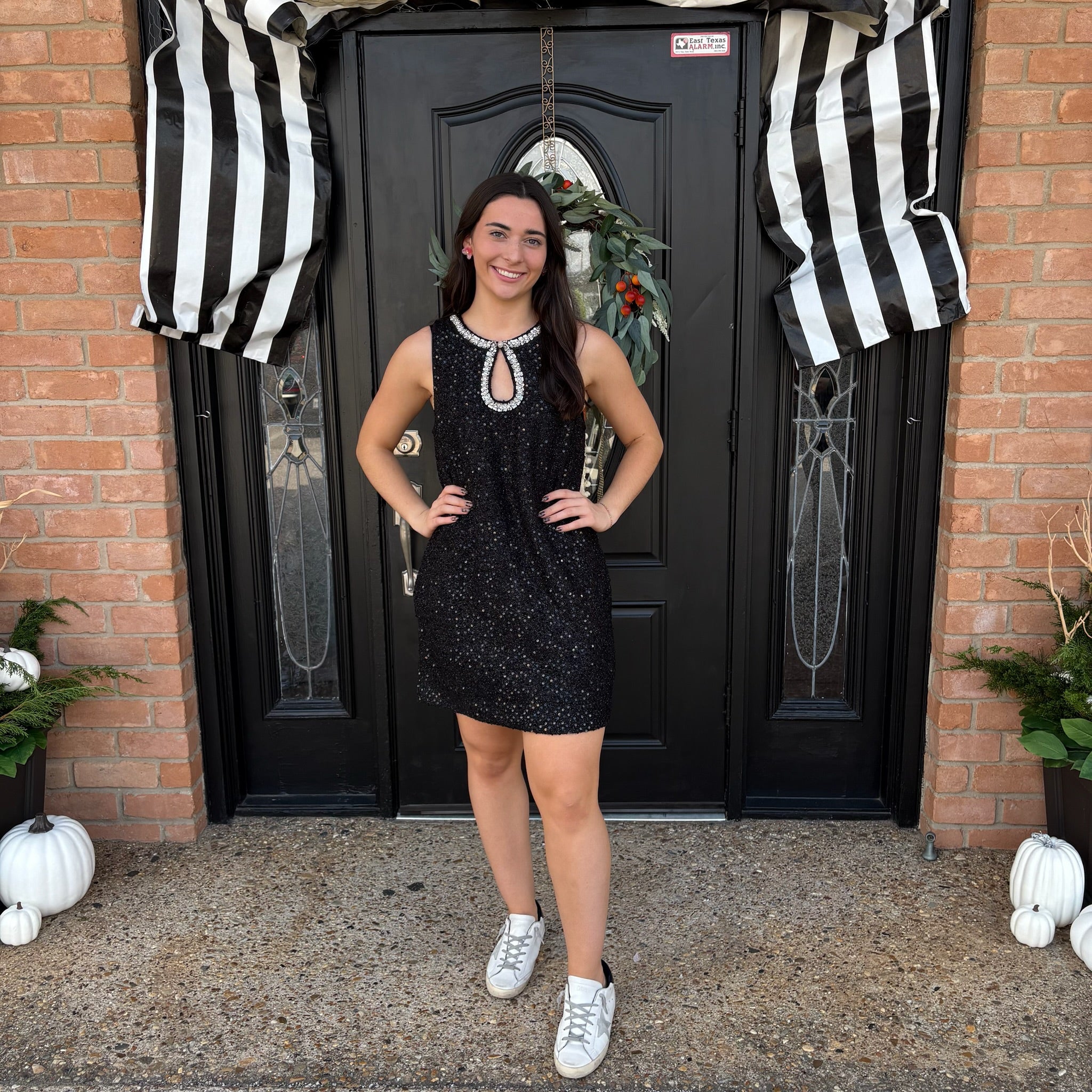 The Finley Dress is a festive, special occasion, sleeveless, black mini dress embellished with black sequins and a unique rhinestone tear drop neckline.