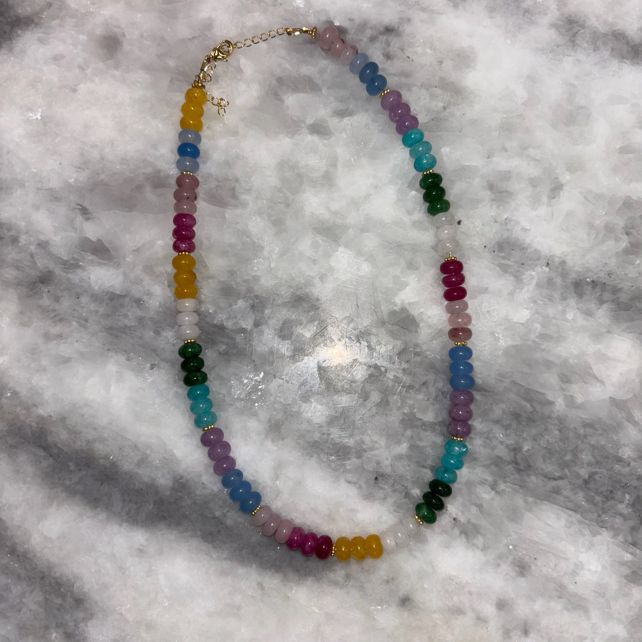 This is a mixed patterned beaded necklace. It is roughly 18in with a 3in extender. Great for layering or making a statement