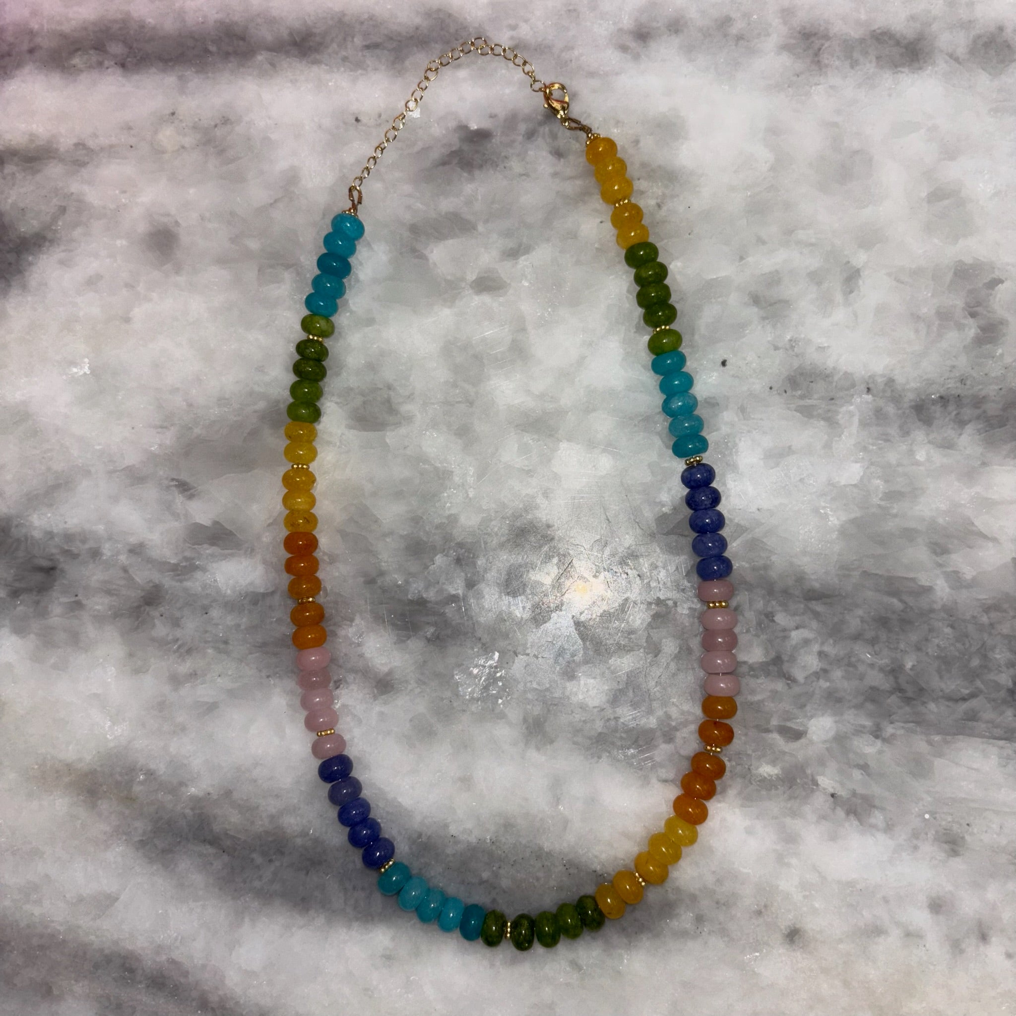 This is a mixed patterned beaded necklace. It is roughly 18in with a 3in extender. Great for layering or making a statement