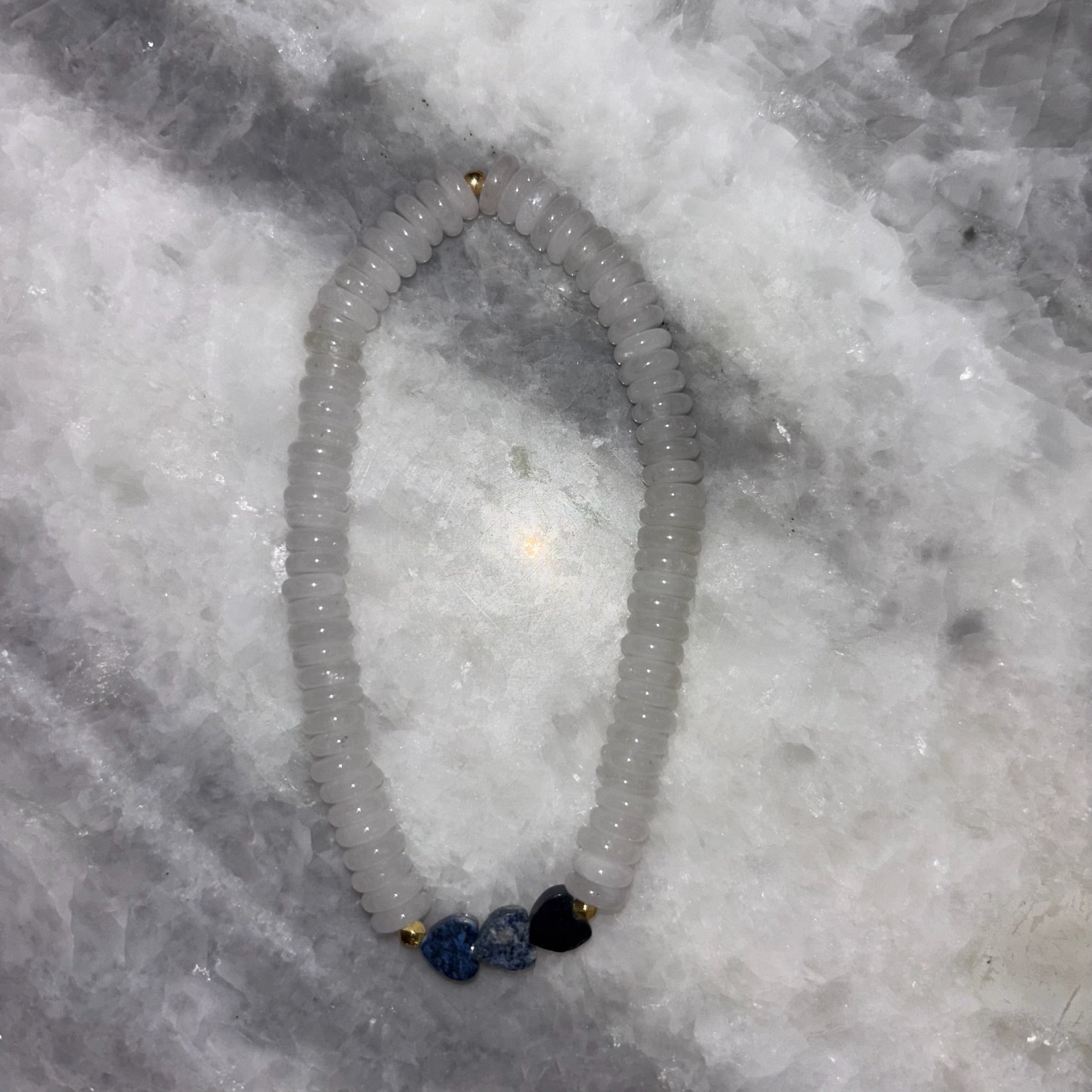 This bracelet is similar to our sweetie bracelet, but with smaller white beads and has three blue hearts.
