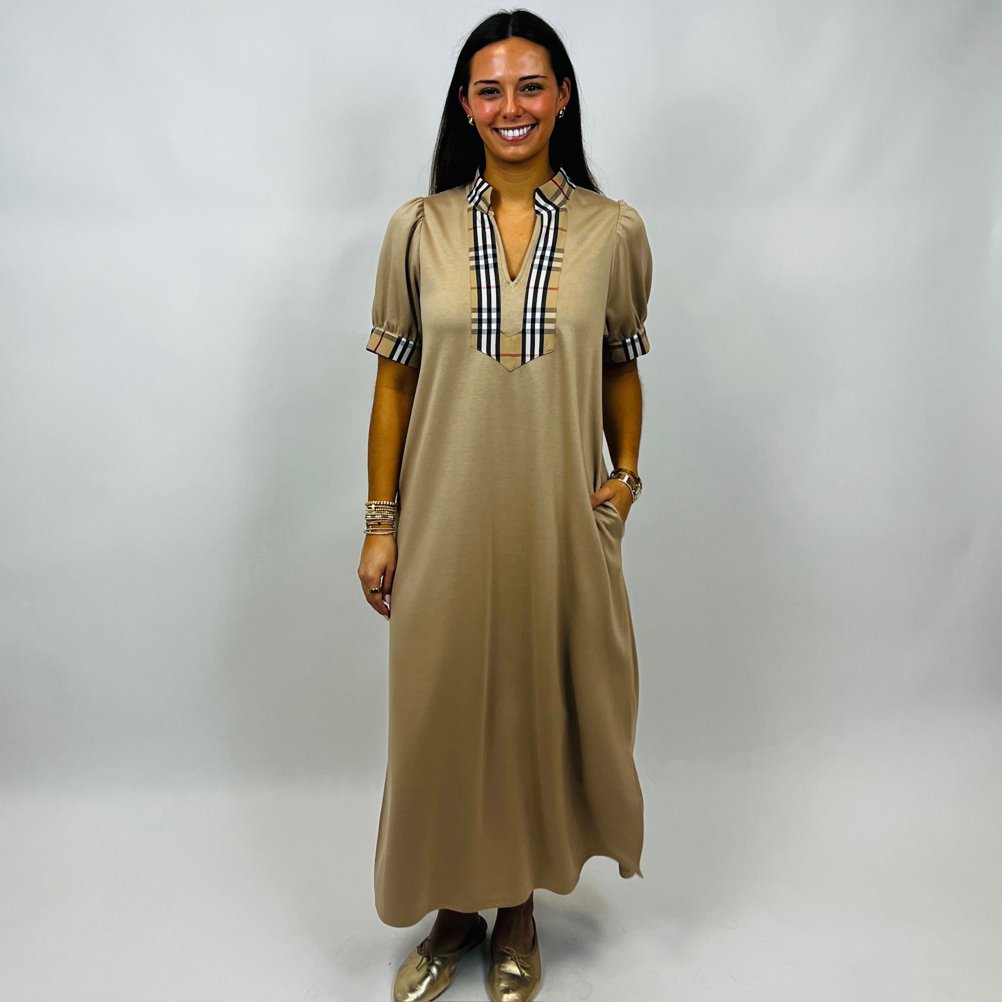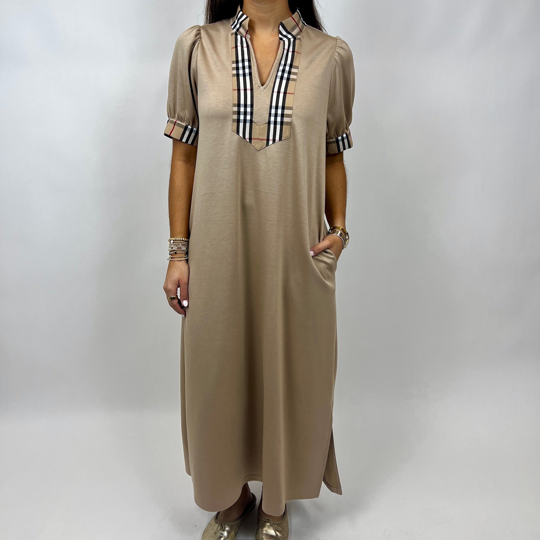 Crafted from soft jersey in a versatile taupe hue, the Diana Dress transitions seamlessly across seasons and occasions. The design features a distinctive high neckline and v-front, both trimmed with cotton plaid detailing in coordinating taupe, black, white, and red tones. A refined staple that balances comfort with understated sophistication.