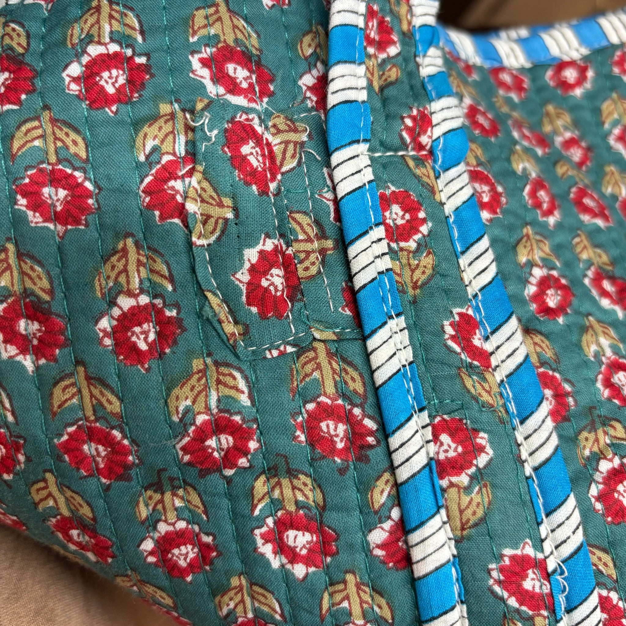 Quilted Tote Bag - Teal & Red Flowers - Damaged (Loose Stitching/Flowers Going Opposite Direction)