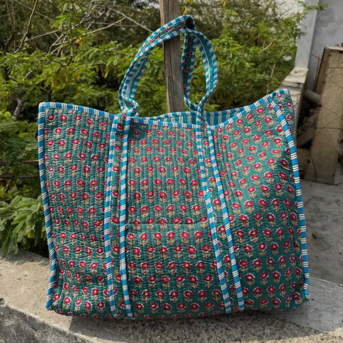 Quilted block print, oversized tote. Perfect for a market tote, beach bag, weekender, and much more! Handmade in small batches, prints are very limited.