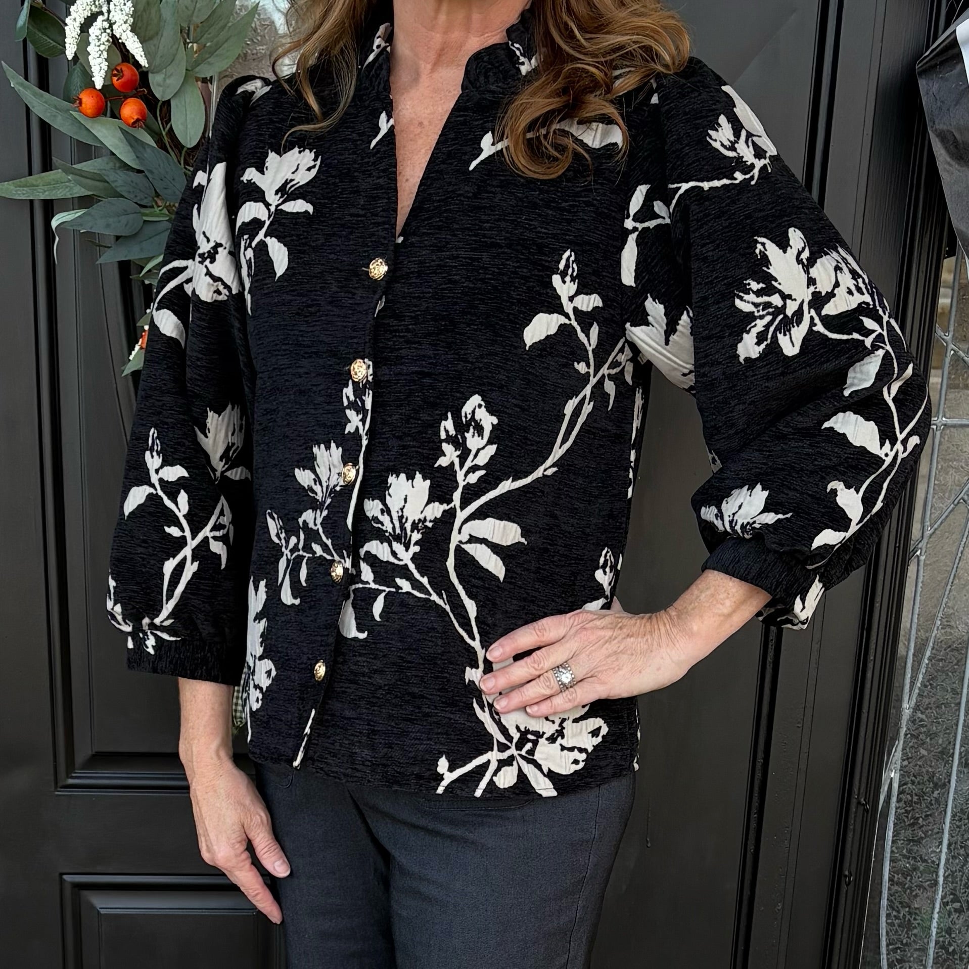 The Irene Black Floral Jacket is an elegant textured black fabric with taupe colored floral detail. The jacket can be worn as a blouse and features brass detailed buttons, puffy sleeves and a ruffled collar.