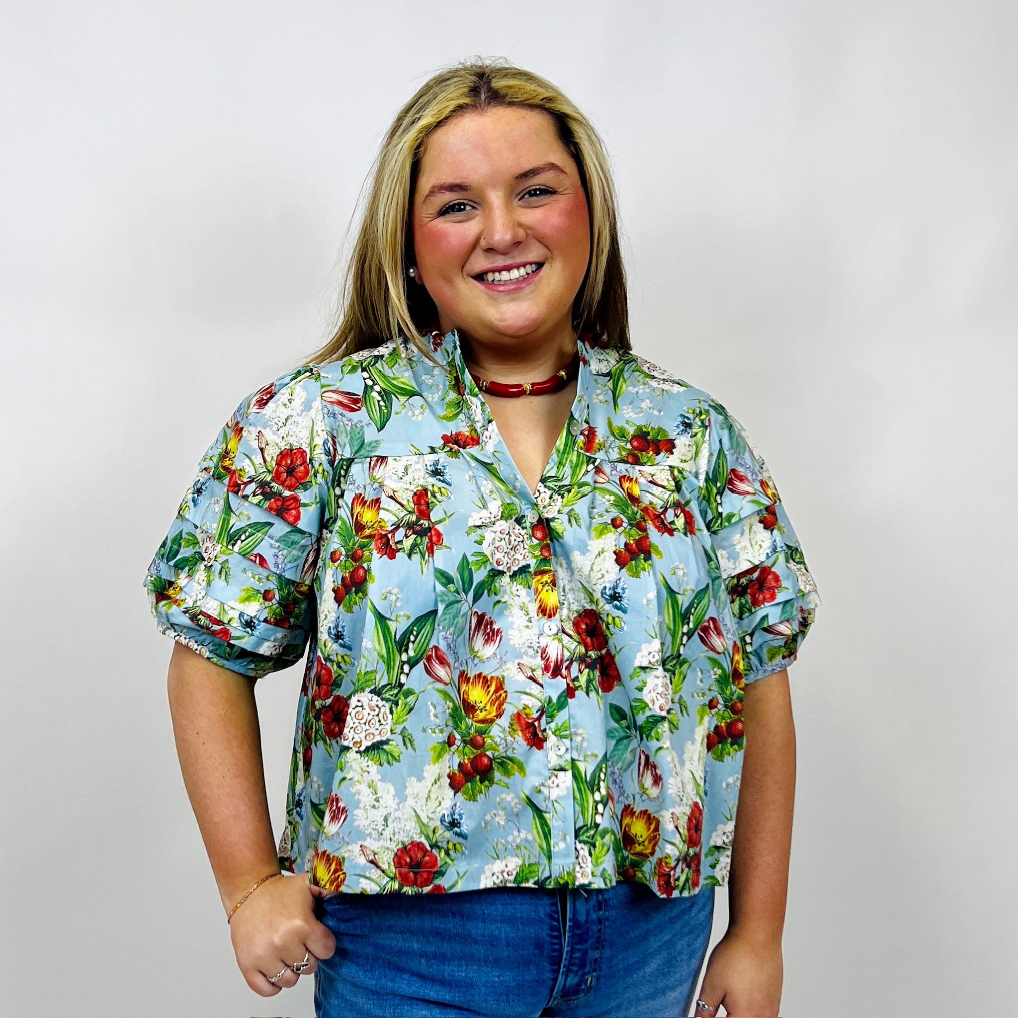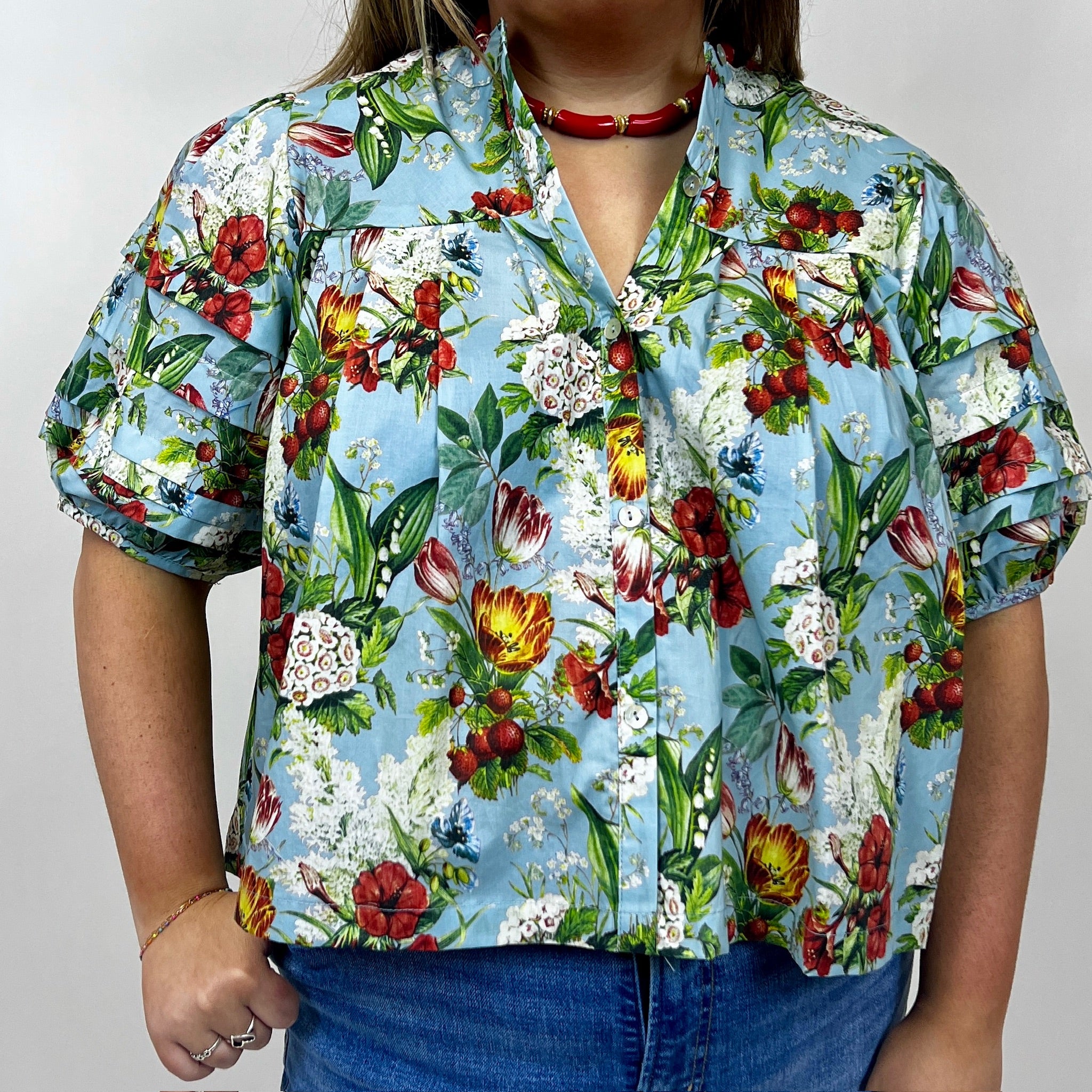 Effortlessly transition this sky blue blouse with jewel-tone florals and lush greenery across seasons. The Margot Blouse moves seamlessly from spring into summer and fall, offering sophisticated versatility for a curated wardrobe.