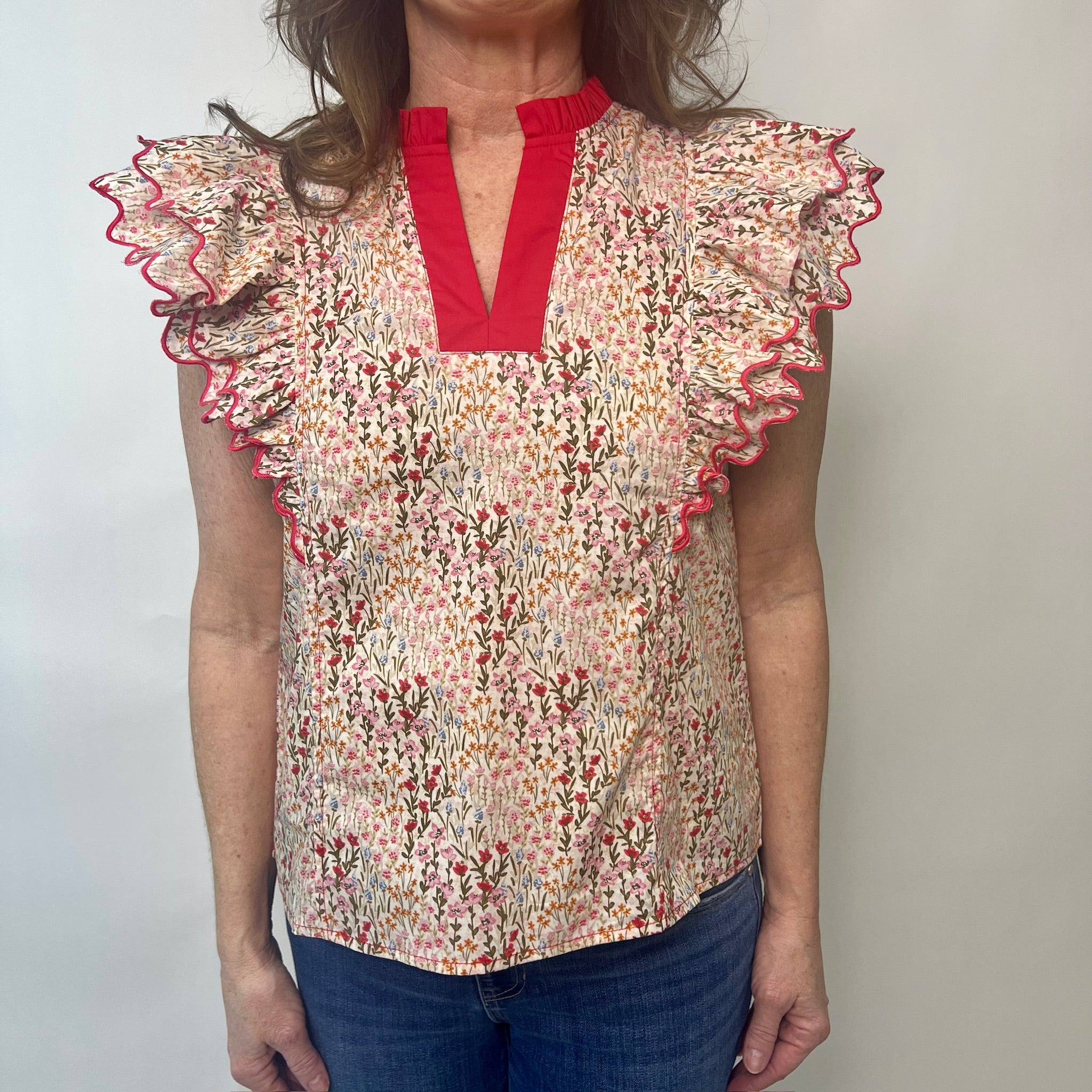 The Farah Blouse brings refined elegance to your everyday rotation with its delicate floral composition rendered in rich jewel tones—red, pink, blue, gold, and green—set against a cream base. The defining V-neckline in contrasting red pairs with scalloped ruffled short sleeves to create understated sophistication. Also offered in green.