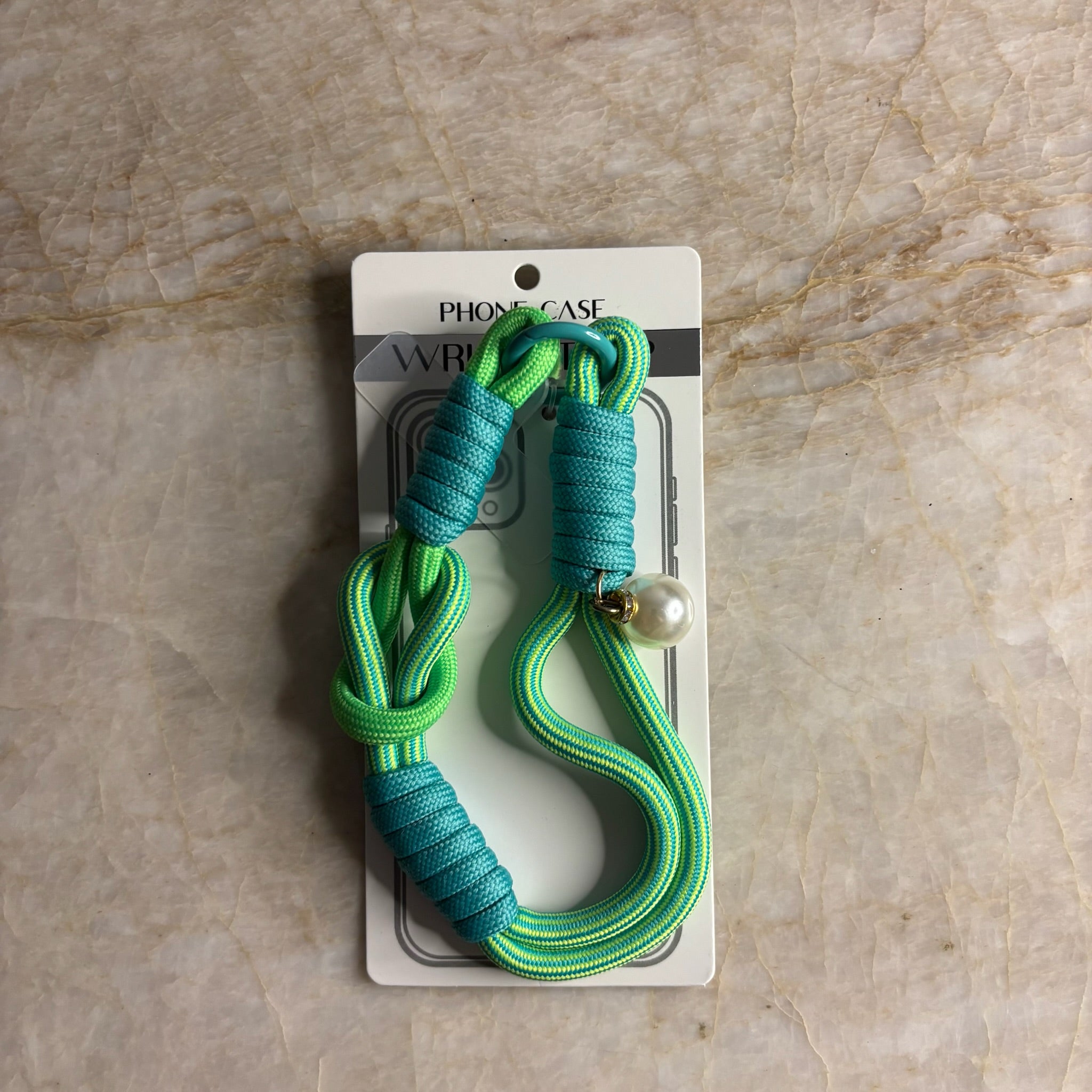 An accessory that attaches to a phone case, featuring a rope strap that loops around the wrist to prevent the phone from being dropped