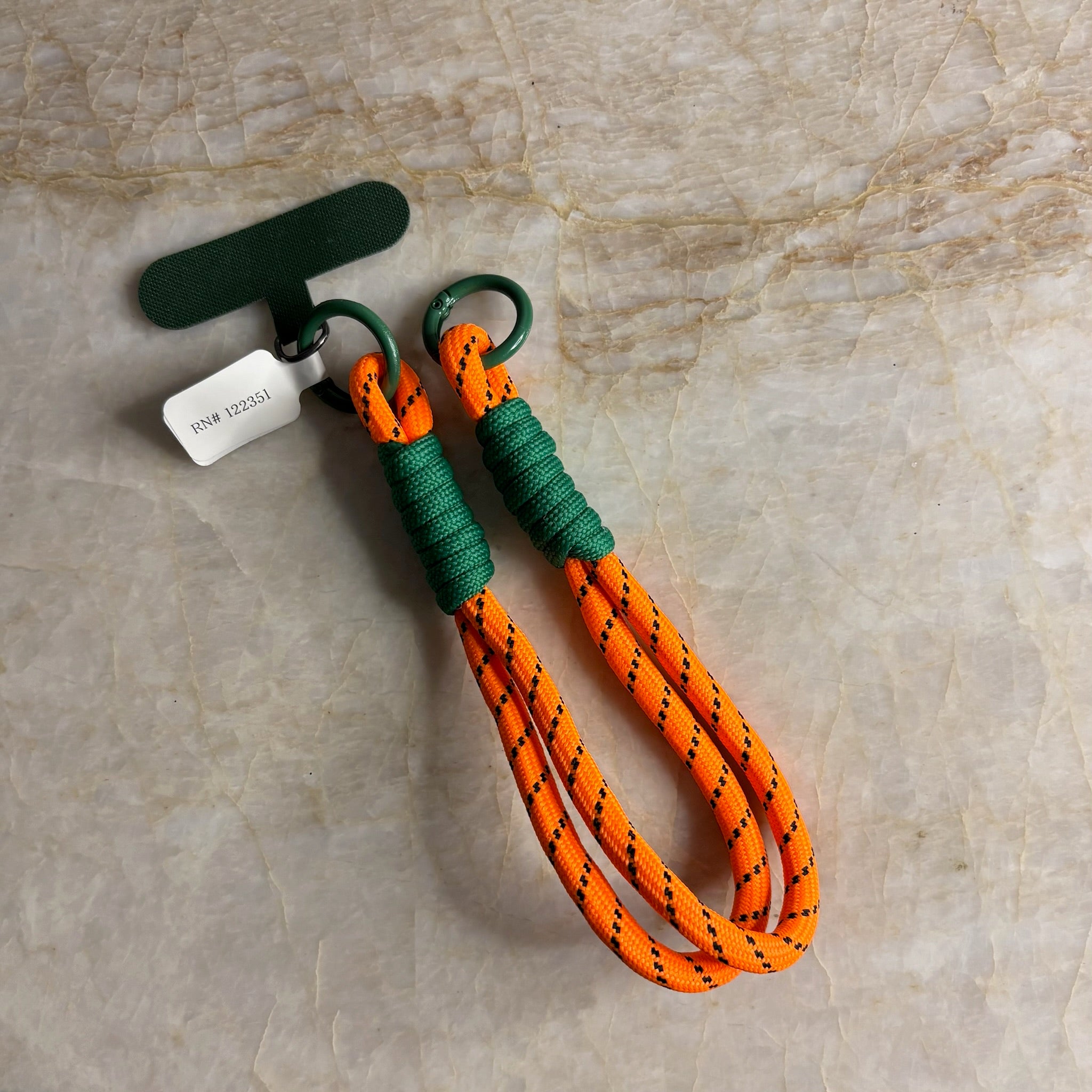 An accessory that attaches to a phone case, featuring a rope strap that loops around the wrist to prevent the phone from being dropped