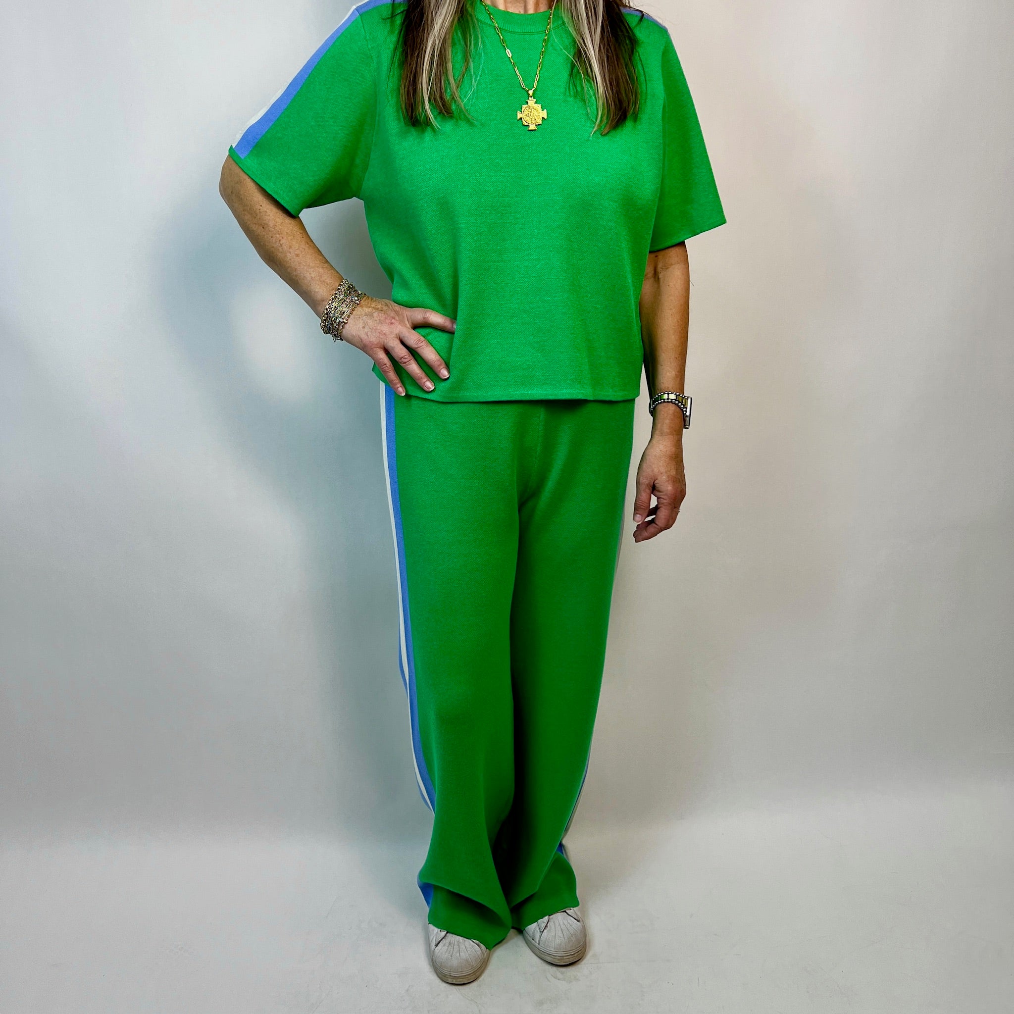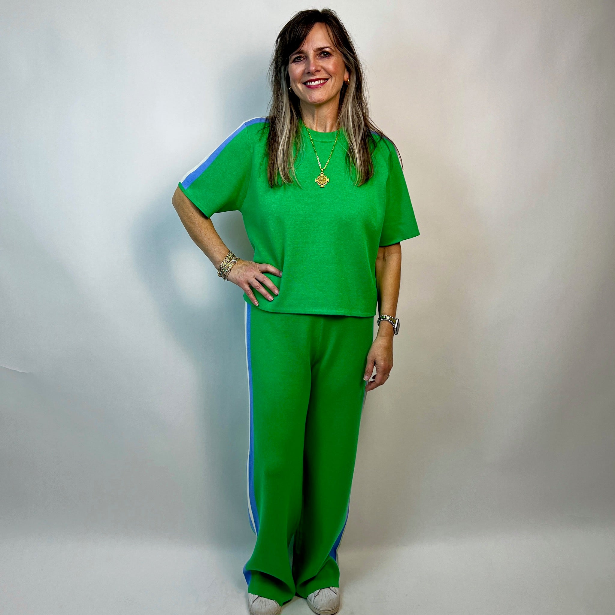 Crafted from lightweight woven fabric in a green hue, the Shamrock Pant Set delivers effortless spring style with its distinctive side stripes in sky blue and cream. The refined color blocking creates visual interest while maintaining the understated elegance of a wardrobe essential.