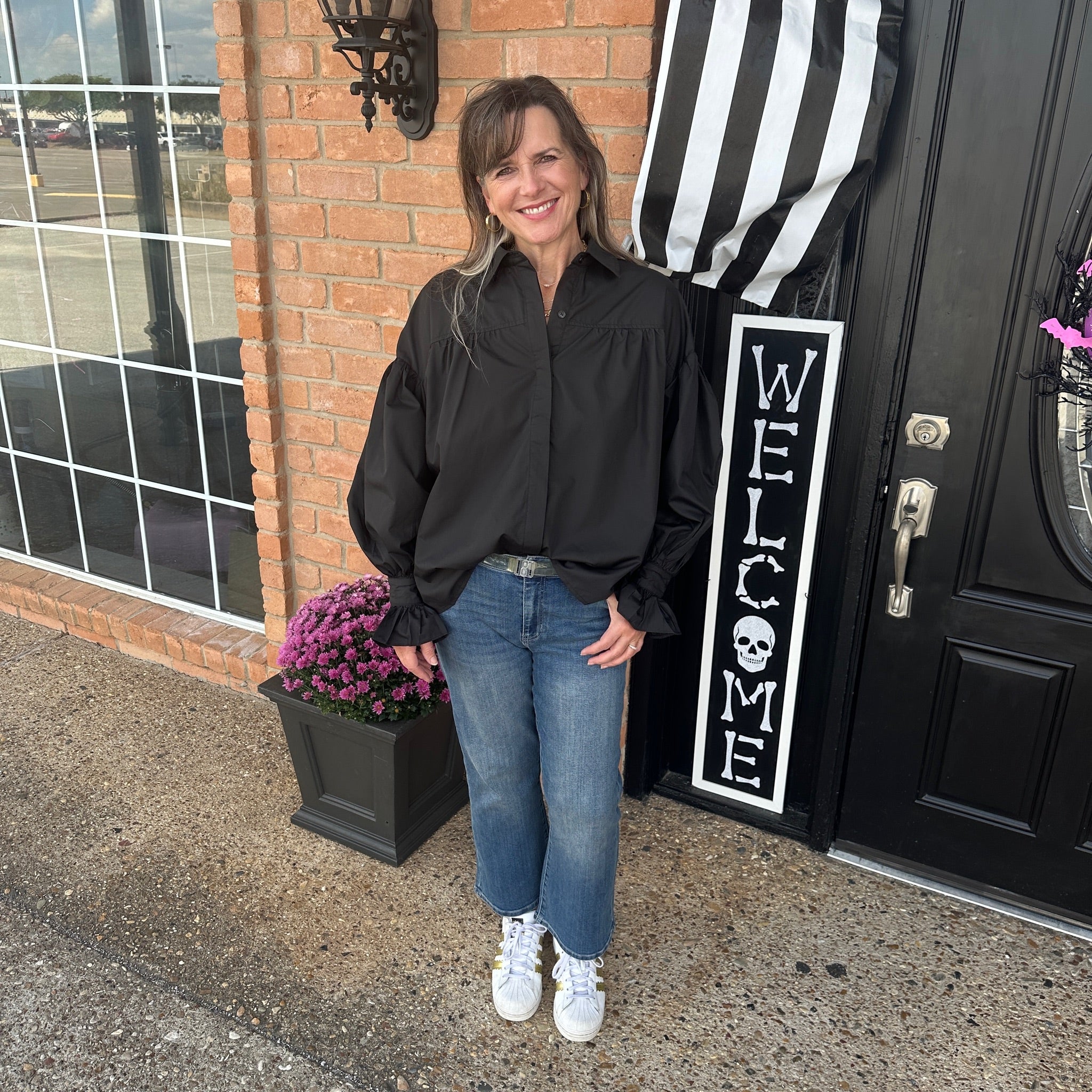 The Stacy blouse is a simple long sleeve black blouse! This blouse has buttons up the front, collar detailing, and a small flare at the sleeves!