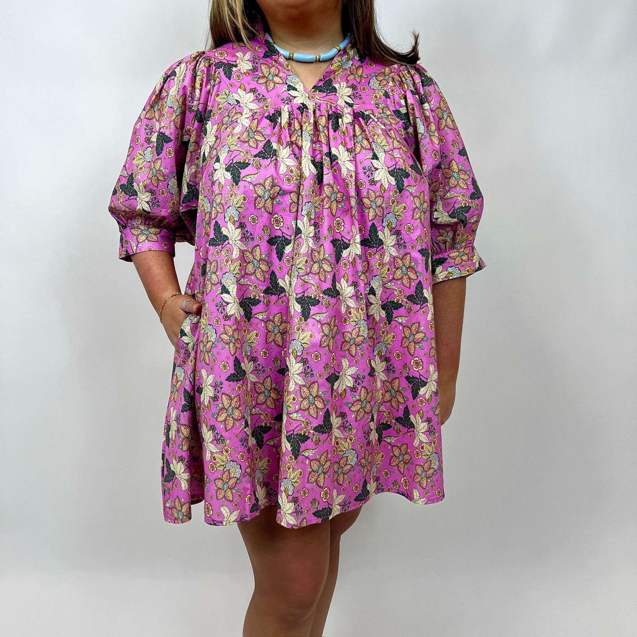 Introducing the Willow Dress—a sophisticated, medium pink silhouette adorned with rich jewel-tone florals and lush greenery. This piece features a refined high neckline with an elegant ruffled collar, complemented by mid-length gathered sleeves finished with tailored cuffs.